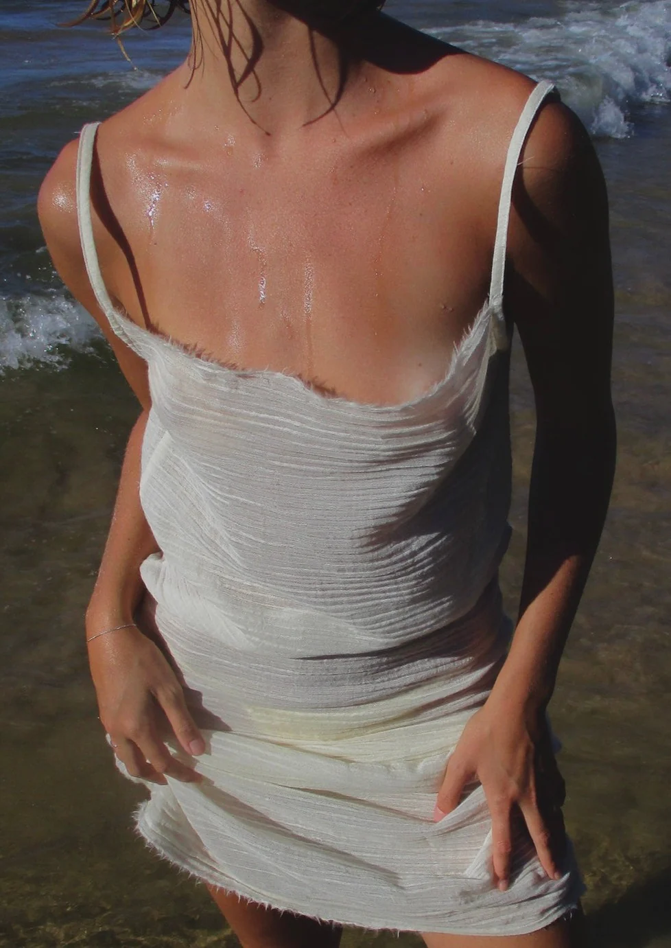 Lightweight slip dress with a low back, made from a thin woven cotton and wool blend. Lili wears size XS.