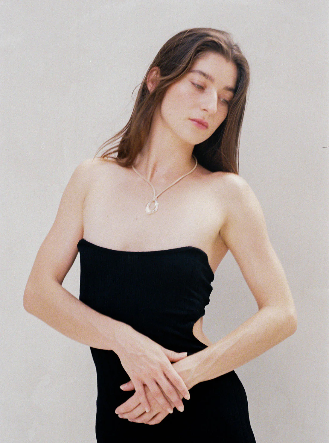 Clear teardrop pendant on flat faux suede cord.